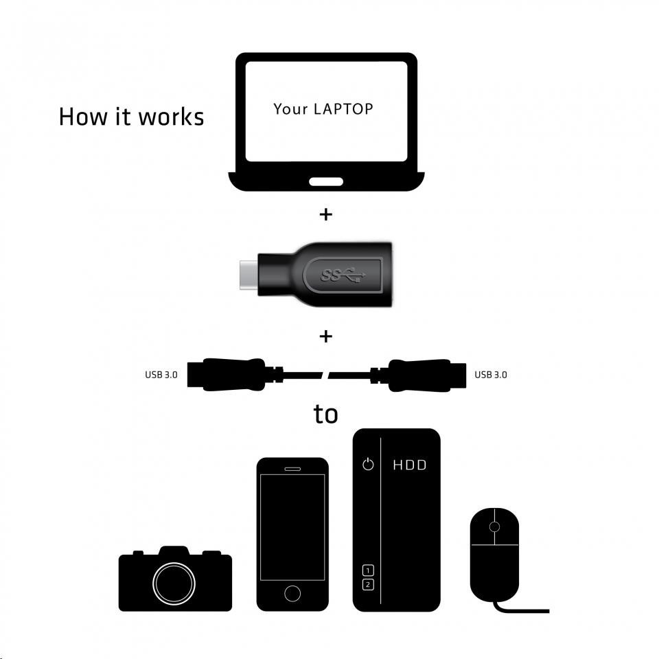 - Připojte zařízení typu USB typu A k notebookům, tabletům a ultrabookům s rozhraním USB 3.1 typu C.