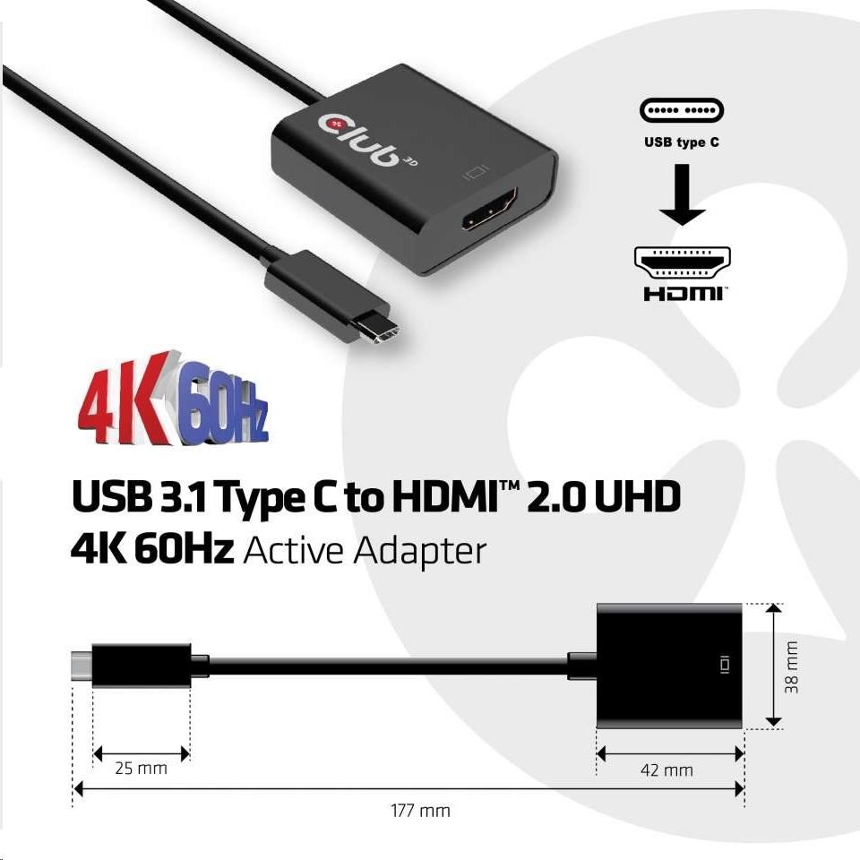 Club3D Adaptér aktivní USB 3.1 typ C na HDMI 2.0 UHD 4K60Hz HDR, 17cm