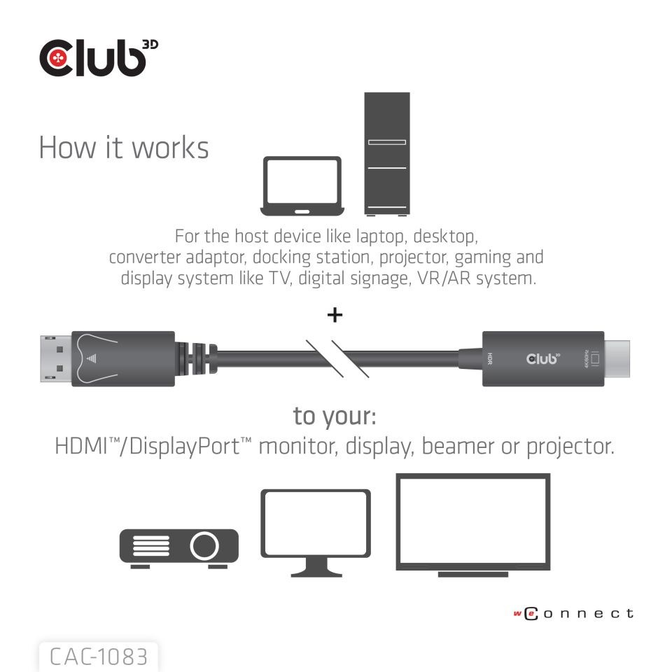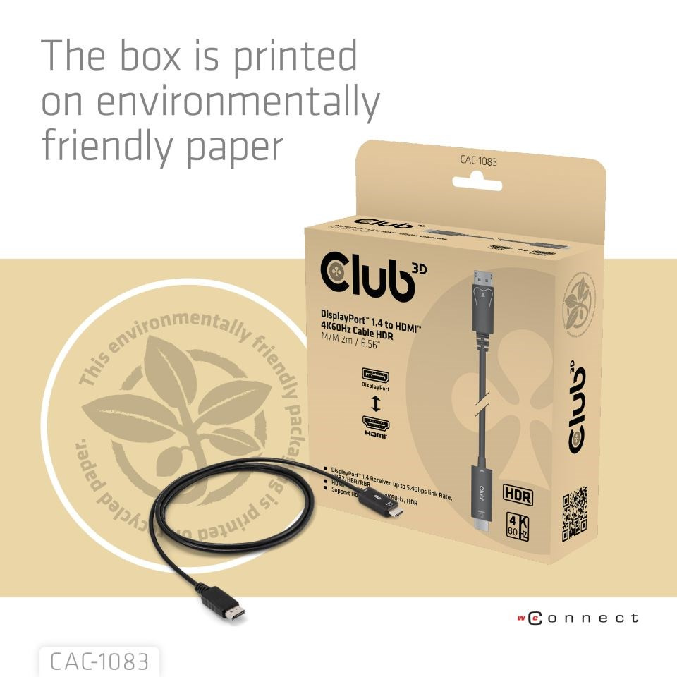 Club 3D CAC-1083 je převodník DisplayPort 1.4 na HDMI 4K60Hz s HDR M/M 2 m. Je vybaven podporou přehrávání multimediálního obsahu v kvalitě HDR Video s hlubokými barvami. Přijímač DisplayPort podporuje rychlost až 5,4 Gb/s na jeden pruh ve 4 linkách. Výstup HDMI je plně v souladu se specifikací HDMI.
