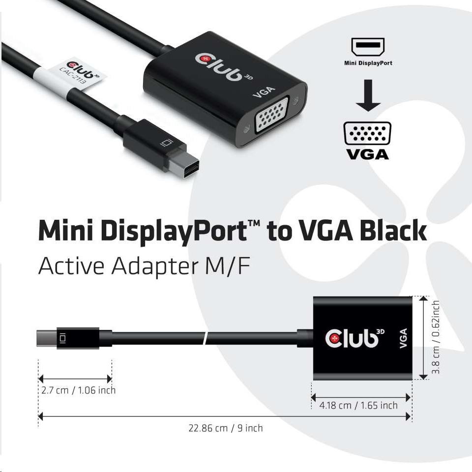 | In the box | Club 3D CAC-2113 MiniDisplayPort™ to VGA Black Active Adapter M/F |