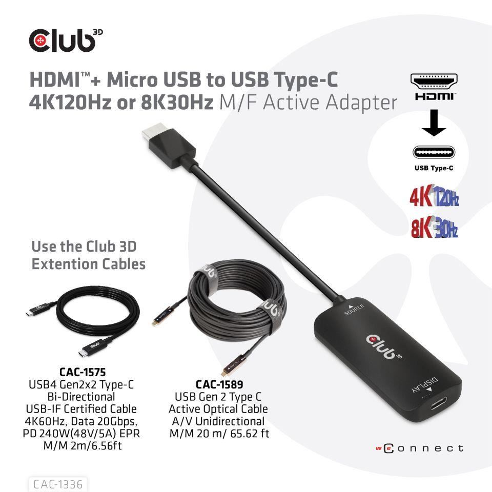 Club3D Adaptér HDMI + Micro USB na USB-C 4K120Hz/8K30Hz, Active Adapter M/F