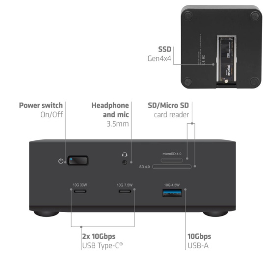 CSV-2562 je certifikovaná dokovací stanice Thunderbolt 5, která sjednocuje všechny nezbytné porty do jednoho zařízení, včetně slotu pro SSD umožňujícího snadné rozšíření úložiště počítače s rychlostí přenosu dat odpovídající internímu disku.