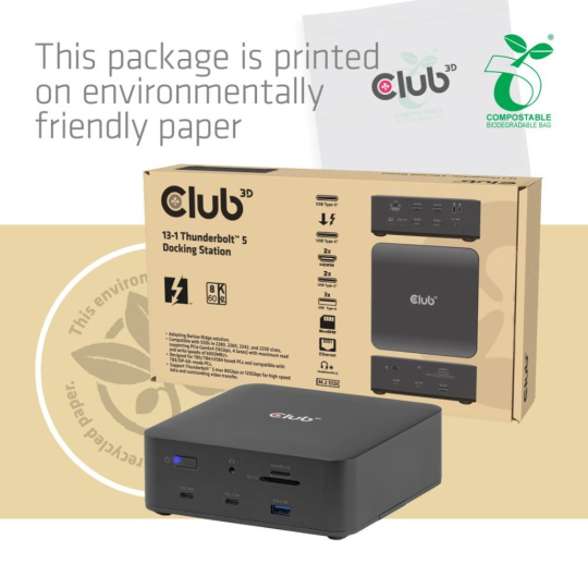 Club3D Dokovací stanice Thunderbolt 5 13v1, 1xUSB-C TB5, 2xUSB-C, 3xUSB-A, 2xHDMI, 1xmicroSD/SD,1xEthernet, 1xM.2