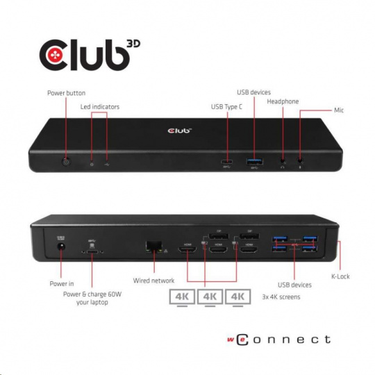 Laptops / UltraBooks / Tablets often have limited connectivity possibilities. By adopting PD Charging technology and upstream-charging function through USB Type C interface the Club3D USB Type C Charging Dock offers unique functionality. It will charge your Notebook up to 60Watts and thru the downstream port on the front you can charge your phone up to 7.5 Watt on the USB C connector.
