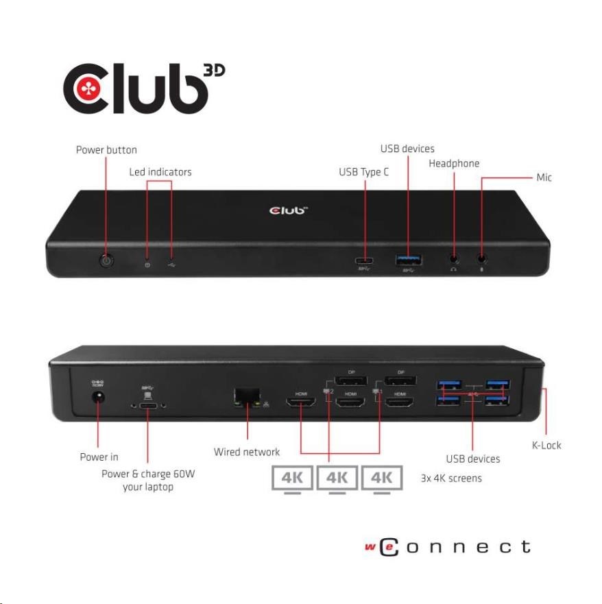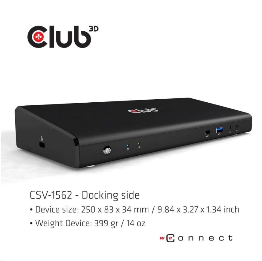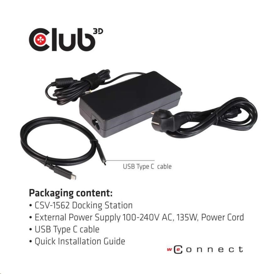 | Package Contents | Club 3D CSV-1562 USB C 3.2 Gen1 Universal Triple 4K Charging Dock External Power Supply 100-240V AC, 135W, Power Cord USB-C cable Installation CD Driver |