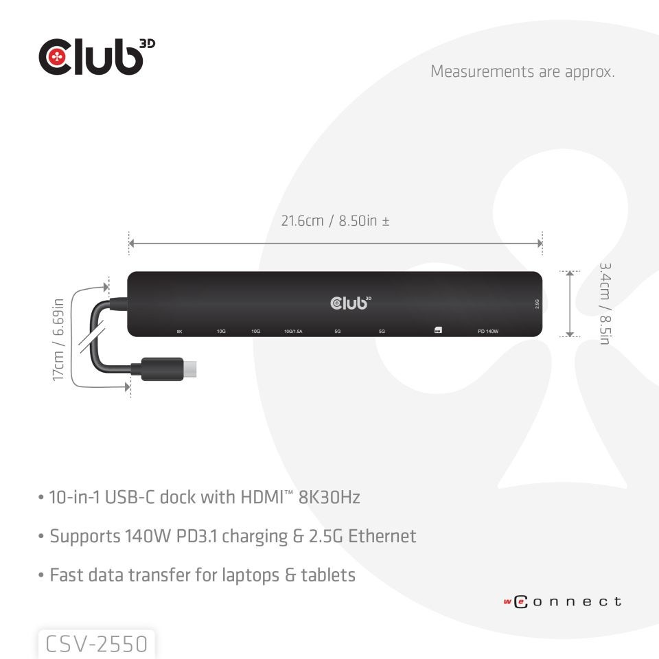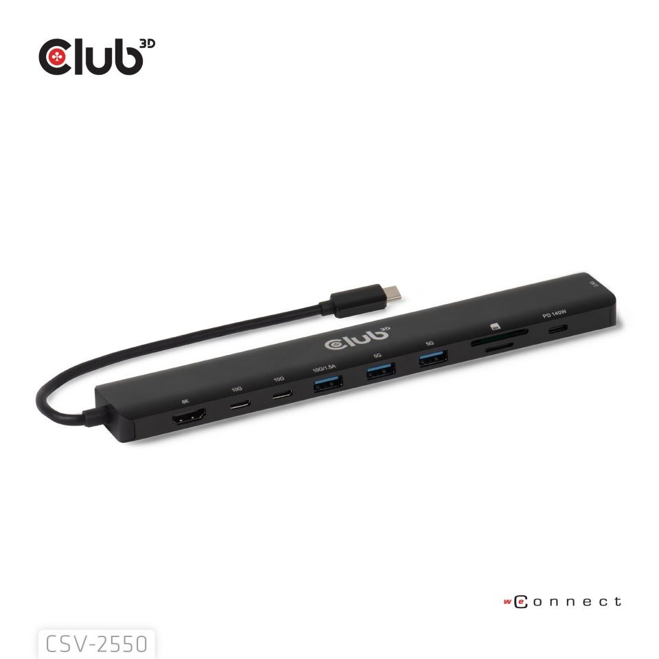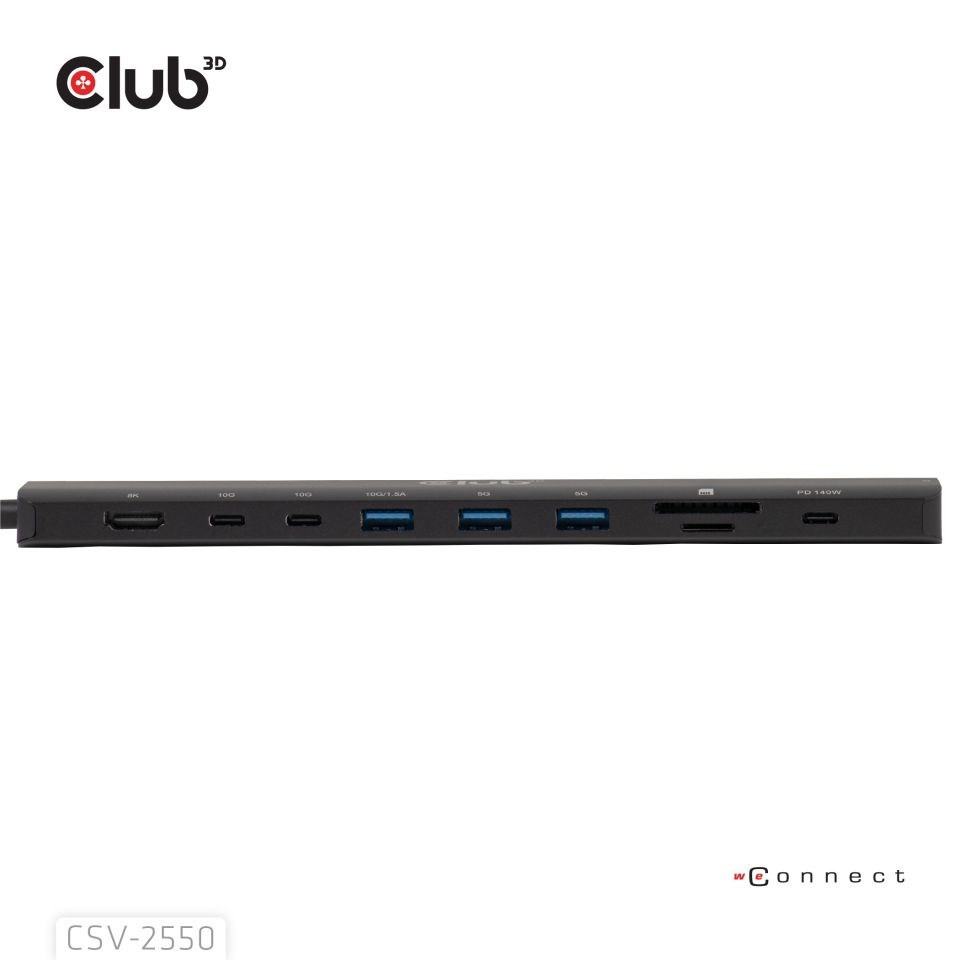 Club 3D CSV-2550 je přenosná dokovací stanice 10-1 USB-C 10Gbps na HDMI 8K30Hz PD3.1 Max.140Watt, která představuje ideální řešení pro rozšíření portu USB-C nebo Thunderbolt hostitele (PC/Laptop/Mobilní telefon atd.), zejména pro hostitele s jediným portem USB-C. Tento rozbočovač umožňuje výstup HDMI s max. 8K30Hz nebo 4K144Hz vysokou obnovovací frekvencí pro přirozenější a plynulejší vizuální zážitek při současném přenosu dat USB 10Gbps. Datové porty 3x USB-A a 2x USB-C umožňují připojit 5 zařízení USB současně. SD/Micro SD umožňují vložit 2 sloty pro karty současně pro přenos dat nebo pro čtení/zápis informací na hostitelském počítači. Port RJ45 umožňuje hostiteli získat přístup k 2,5Gigabitovému Ethernetu. Kromě toho podporuje USB-C samice PD 3.1 s maximálním 140W PD nabíjením. Může fungovat na všech hostitelských zařízeních USB-C s podporou režimu DP Alt.