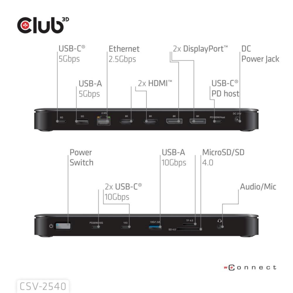 Club3D Dokovací stanice USB-C 14v1, 2xHDMI, 2xDP, 3xUSB-C, 1xUSB-C PD, 2xUSB, 1xRJ45, 1x3.5mm, microSD/SD, černá