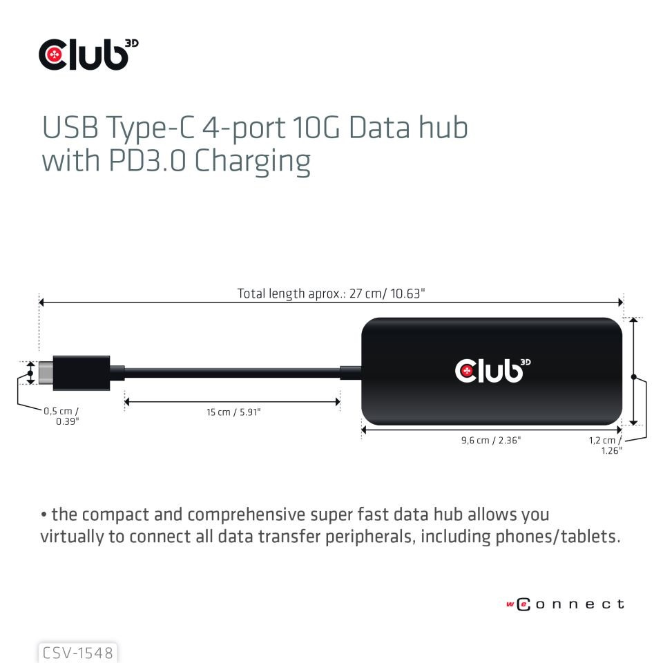Club 3D CSV-1548 USB Type-C 4portový 10G datový rozbočovač s nabíjením PD3.0, kompaktní a komplexní super rychlý datový rozbočovač umožňuje virtuálně připojit všechna periferní zařízení pro přenos dat, včetně telefonů/tabletů. Rozbočovač je kompatibilní s novými periferními zařízeními USB Gen2 i zpětně kompatibilní se staršími zařízeními USB, maximální rychlost přenosu dat až 10 Gbps (1280 MB/s). Rozšířené připojení pro stávající zařízení, jako je pevný disk, SSD, USB flash, myš, klávesnice a/nebo tiskárna. Hub také podporuje nabíjení Power Delivery 3.0 na 1 portu.