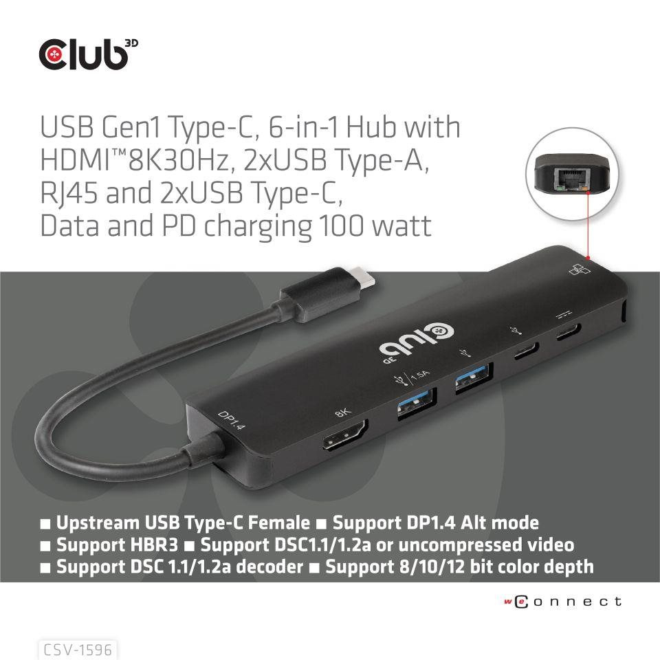 The Club 3D CSV-1596 is a USB Gen1 Type-C, 6-in-1 Hub with HDMI™8K30Hz, 2xUSB Type-A, RJ45 and 2xUSB Type-C, Data and PD charging 100 watt, providing an ideal solution for extending the port of Type-C/Thunderbolt host (PC/Laptop/Mobile phone,etc.), especially for those host with a single Type-C port. This hub adopts the latest DP1.4 Alt mode supported IC, enabling to output HDMI™ video with max. 8K30Hz and at the meanwhile transfer USB 3.1 data with max 5Gbps. The USB Type-A and Type-C data ports allow you to connect 4 USB devices simultaneously. 1 Gigabit Ethernet for super fast Ethernet. Besides, the Type-C female supports PD 3.0 PD Charging 100W (15W is dedicated to the functioning of this product, the rest power(max 85W) will be passed to charge for the host. This 6-in-1 Hub will work on all DP Alt mode supported Type-C hosts.