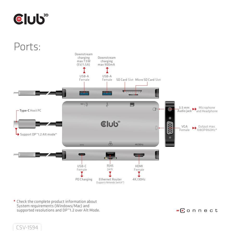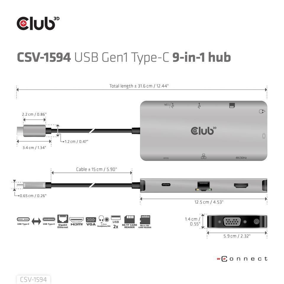 The Club 3D CSV-1594 USB Gen1 Type-C 9-in-1 hub with HDMI™, VGA, 2x USB Gen1 Type-A, RJ45, SD/Micro SD card slots and USB Gen1 Type-C Female port, provides a very advanced, efficient solution to extend a single USB Gen1 Type-C port to be multiple ports. It integrates video, data and power ports that allows to connect 2 displays simultaneously for enjoying videos on a larger screen, connect multiple USB Gen1 devices for data transmission up to 5Gbps, connect a Gigabit Ethernet source for getting your PC connected to super high speed network, or connect to headset to enjoy fantastic music. It also provides PD charging for support up to max. 100W PD charging. This is for operating this device and charge the host simultaneously. It can work on all DP™1.2 Alt mode supported USB Gen1 Type-C hosts.