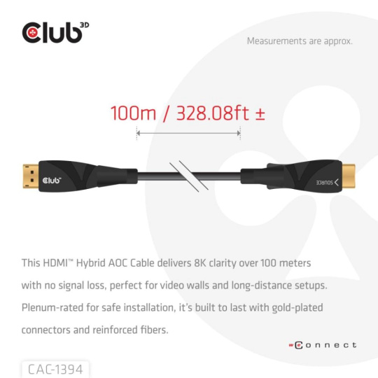Club3D Kabel aktivní hybridní optický HDMI 2.1 8K60Hz/4K120Hz, (M/M), 100m
