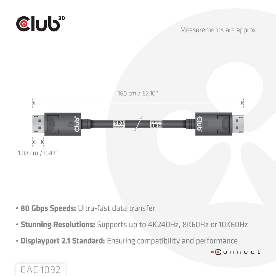 Kabel Club 3D CAC-1092 DisplayPort™ 2.1 umožňuje připojení vašeho (herního) PC nebo notebooku s podporou DisplayPort™ k monitoru (Ultra) s vysokým rozlišením nebo jinému zařízení s podporou DisplayPort™. DisplayPort™ 2.1 UHBR10/13.5/20 až 80 Gb/s, má také podporu pro Display Stream Compression 1.2 (DSC), Forward Error Correction a rozšiřuje maximální počet vložených audio kanálů na 32. Disponuje uzamykatelnými konektory DisplayPort™ zajišťujícími bezpečný , spolehlivé spojení, s NOVÝMI kontaktními prsty speciálně navrženými pro tyto vysoké rychlosti. Jednoduše stiskněte vestavěné jednodotykové tlačítko pro odemknutí konektoru. Měkký plášť UltraFlex chrání kabel před ohybem a poškozením deformací.