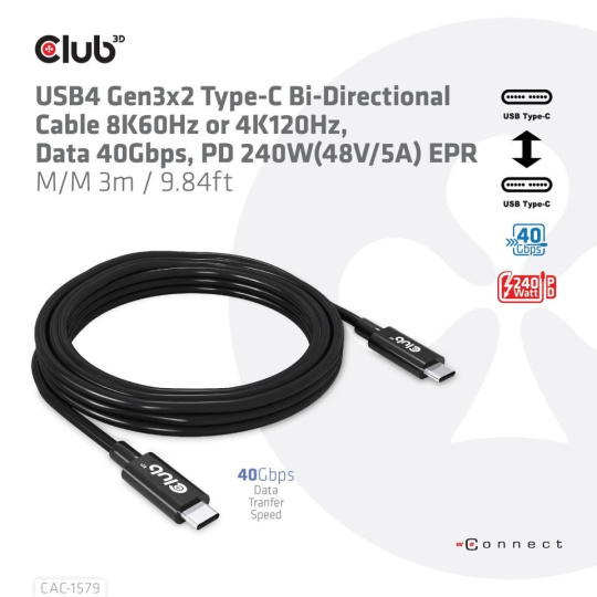 Obousměrný kabel Club 3D CAC-1579 USB4 Gen3x2 Type-C 8K60Hz nebo 4K120Hz, Data 40Gbps, PD 240W(48V/5A) EPR M/M 3m / 9,84ft propojí váš notebook, tablet nebo telefon s výstupem USB4 Type-C k vašim oblíbeným stávajícím periferním zařízením, příslušenství a nabíječkám. Umožňuje video, data a napájení přes jediný kabel a oběma způsoby. Vestavěné čipy Re-timer s vylepšeným signálem pro vylepšení funkcí na delší vzdálenost než pasivní kabel USB Type-C, spolu s čipy E-marker na obou koncích kabelu poskytují tomuto kabelu podporu pro USB4 Gen3x2 Type-C Bi -Směrové video 8K60Hz nebo 4K120Hz, Data 40Gbps, PD 240W (48V/5A) EPR M/M na délku 3 m / 9,84 stop pro nabíjení nebo napájení vašeho notebooku, tabletu nebo smartphonu.