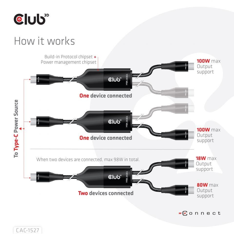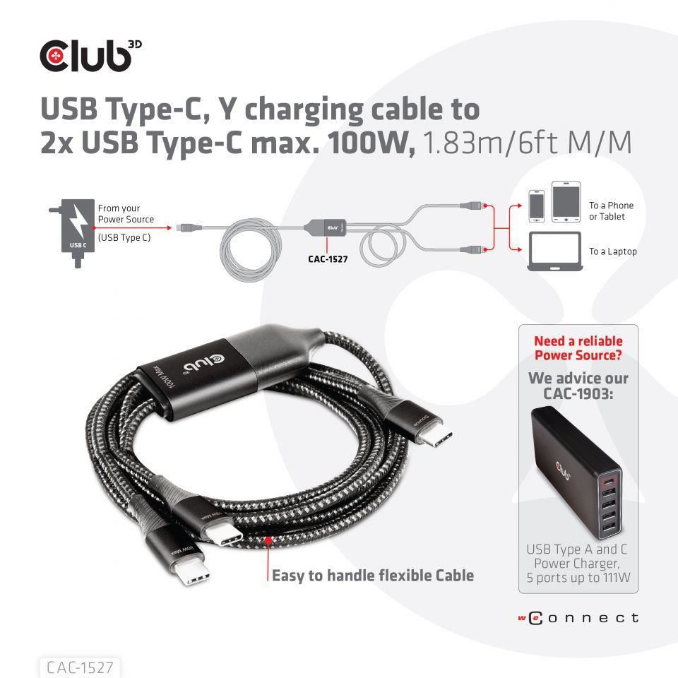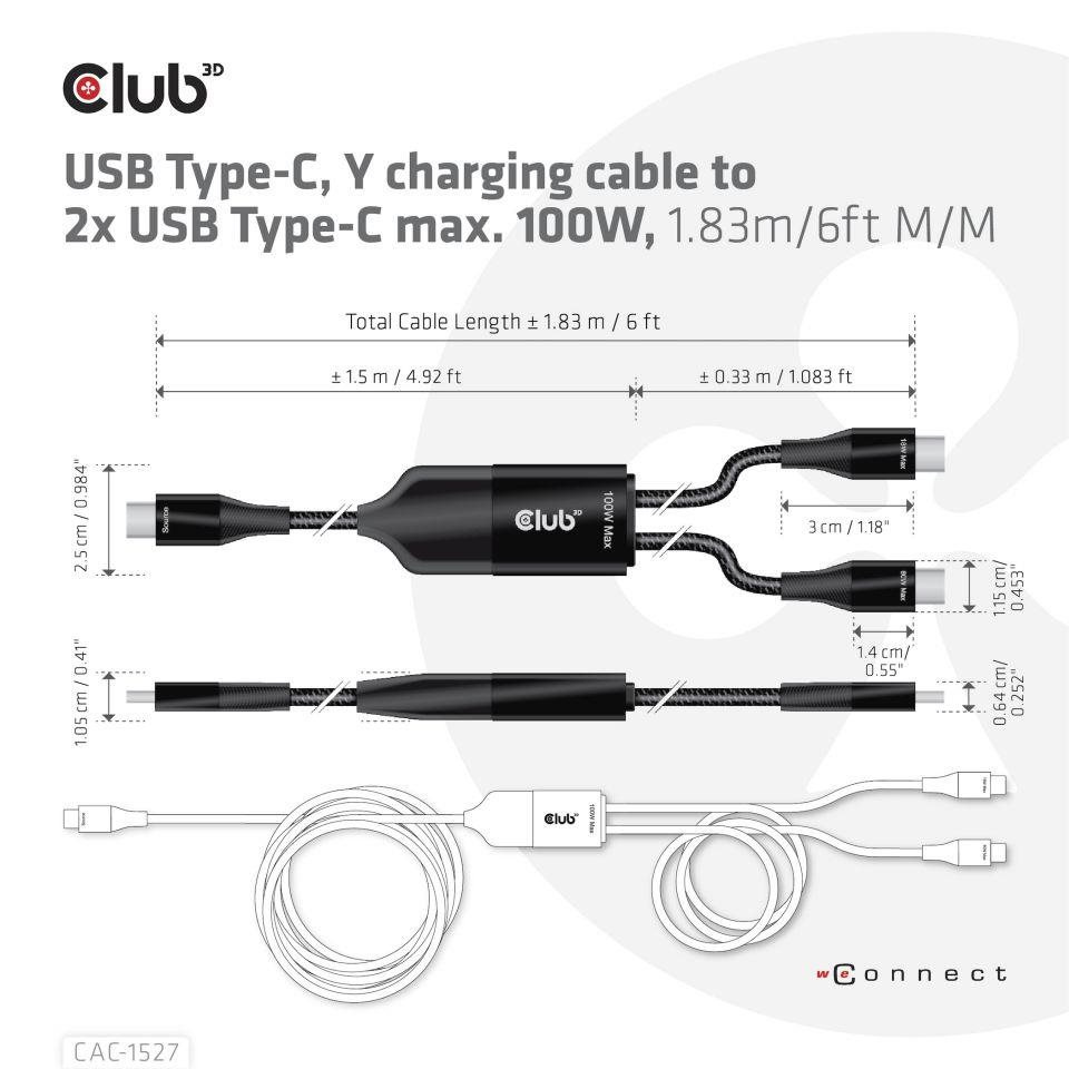 Club3D nabíjecí kabel USB Type-C, Y charging cable to 2x USB Type-C max. 100W, 1.83m/6ft M/M