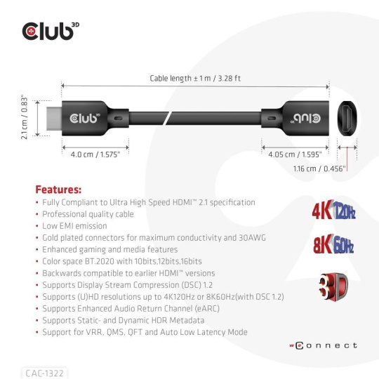 The Club 3D CAC-1322 Ultra High Speed HDMI™2.1 Extension Cable is built to handle the highest quality video- and audio- signals. HDMI™2.1 Increased Bandwidth to 48Gbps.The increase in maximum bandwidth compared to previous versions is achieved by increasing both the bitrate of the data channels (from 6Gbps to 12Gbps) and the number of channels (from 3 to 4). This allows support for resolutions up to supports 4K120Hz or 8K60Hz! New feature included in this Specification is Display Stream Compression (DSC) 1.2, this is used for video formats higher than 8K with 4:2:0.