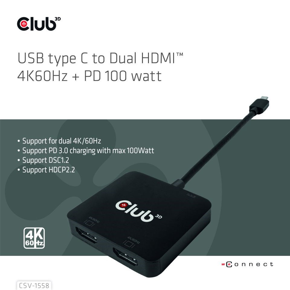 Club 3D CSV-1558 USB Type-C to Dual HDMI™ 4K60Hz + PD 100 watt Nabíjení v režimu DP1.4 Alt, umožňující rozšířit port USB Type-C hostitele na 2x HDMI™ displeje s ultra vysokým rozlišením max 4K60Hz pro každý displej současně. Díky podpoře funkce MST lze duální displeje zobrazovat současně s různým obsahem videa. Kromě toho podporuje nabíjení PD s maximálním výkonem 100 W. Může fungovat na všech zařízeních USB Type-C nebo Thunderbolt™ s podporou režimu DP™ Alt (včetně telefonů s připojením USB Type-C a podporou režimu DP™ Alt).