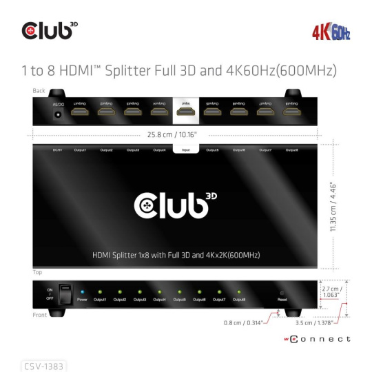 Club 3D CSV-1383 je vysoce výkonný a malý 1 až 8 HDMI™ Ultra High Definition Splitter s hot plug a železným pouzdrem. Distribuuje vstup signálu HDMI™ do osmi identických výstupů současně. Poskytuje vysoce výkonný audio a video výstup prostřednictvím kabelů HDMI™ až do rozlišení 4K@60Hz a je schopen přijímat a přenášet šířku pásma až 6Gbps/600MHz.
