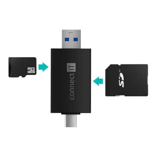 Praktická externí čtečka paměťových karet s konektory USB-A 3.0 a USB-C Dual Gear umožňuje kdekoliv přenášet obsah mezi vašimi paměťovými kartami a počítačem. Používá (zpětně kompatibilní) vysokorychlostní rozhraní USB 3.0, díky němuž je zajištěn bezproblémový a bleskový přenos dat mezi zařízeními. Čtečka má tvar flashdisku, takže ji lze snadno přepravovat a vzít si ji třeba i na cesty. Potěší i praktické krytky USB konektorů, které zabraňuje vniknutí nečistot a prachu, čímž předchází jakýmkoliv problémům. Přenosová rychlost 5 Gbps