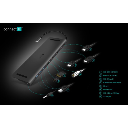 CONNECT IT Dokovací stanice USB-C 11v1, 2xHDMI, 2xUSB-C, 3xUSB, 1xRJ45, čtečka SD karet, černá