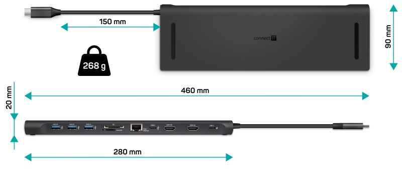 Prakticky tvarovaná USB-C dokovací stanice "Multi11in1" pro připojení až 11 periferií (2x USB-C, 2x HDMI, 3x USB-A, 3.5 mm jack, RJ45 Gigabit Ethernet. SD karta, MicroSD karta).