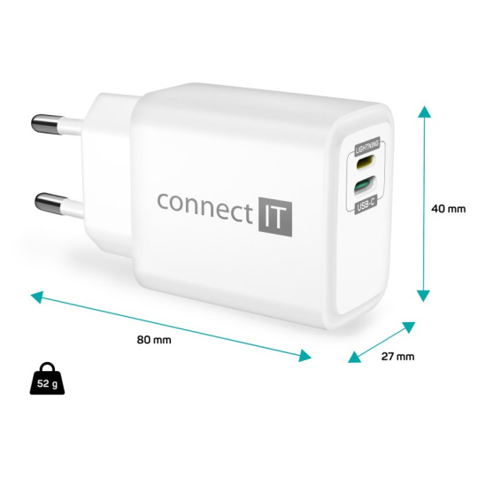 Unikátní cestovní nabíječka CONNECT IT "Duplex" disponuje dvěma porty - Lightning a USB-C. Díky této ojedinělé technologii lze nabíjet zařízení jak s Lightning vstupem, tak USB-C vstupem jedním univerzálním kabelem. Nabíječka je určená pro napájení i nabíjení mobilních telefonů, tabletů, power bank, akčních kamer, elektronických čteček knih, MP3 a MP4 přehrávačů, herních konzolí a mnoha dalších přenosných zařízení doma, v kanceláři i na cestách. Technologie Power Delivery (PD) umožňuje rychlonabíjení o výkonu 20 W. Součástí balení je i velice kvalitní kabel Lightning -> USB-C, který dokáže přenést až 27 W.