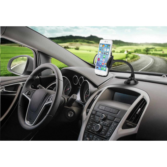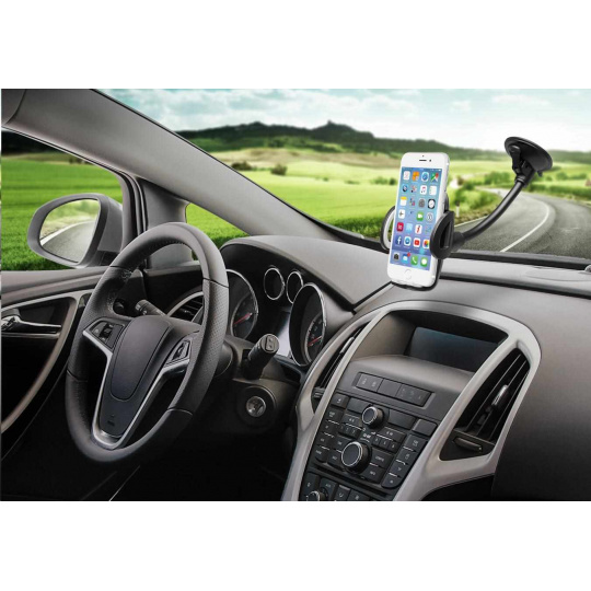 Univerzální držák do auta slouží k uchycení mobilního telefonu na sklo nebo palubní desku vozu.