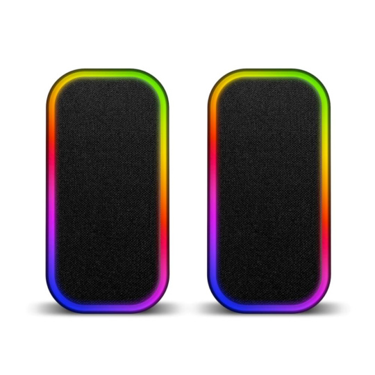 Reproduktory jsou vybaveny RGB Rainbow podsvícením a ovládáním hlasitosti/podsvícení/vstupu na kabelu.