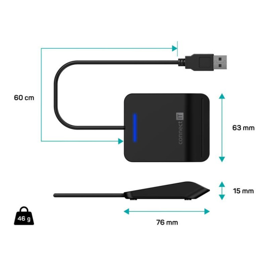 - Snadná instalace Plug & Play bez nutnosti instalace a stahování ovladačů (čtečku stačí pouze připojit k USB portu počítače nebo notebooku)