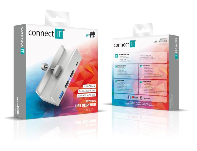 CONNECT IT USB Hub DeskHub, 1xUSB-C, 1xUSB 3.2, 2xUSB 2.0, stříbrná