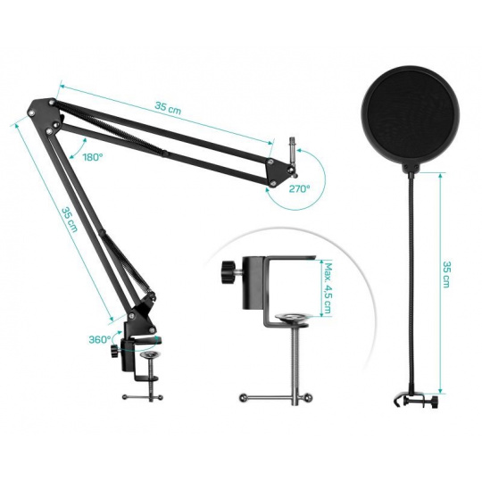 Teleskopické rameno s pružinovým mechanismem a třemi klouby pro snadné nastavení výšky a úhlu mikrofonu, který je bezrezonančně uchycen v držáku. Průměr POP filtru 15 cm zajištuje dokonalou ochranu a prodlužuje životnost mikrofonu.
