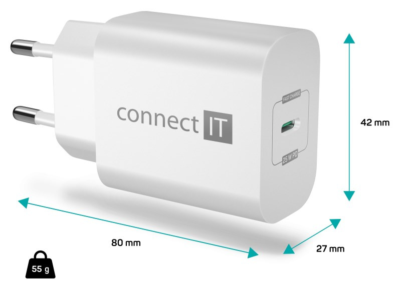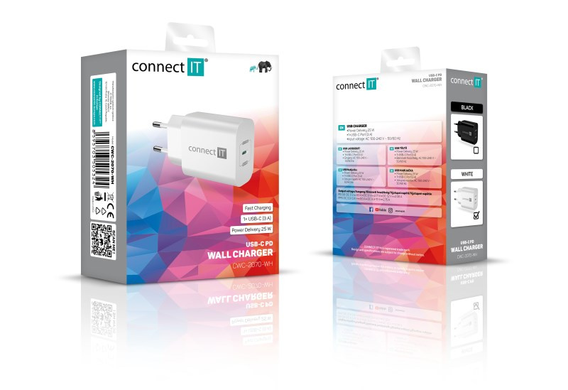 Cestovní USB nabíječka CONNECT IT "Voyager2" určená pro napájení i nabíjení mobilních telefonů, tabletů, power bank, akčních kamer, elektronických čteček knih, MP3 a MP4 přehrávačů, herních konzolí a mnoha dalších přenosných zařízení doma, v kanceláři i na cestách. Technologie Power Delivery (PD) umožňuje rychlonabíjení o výkonu 25 W.