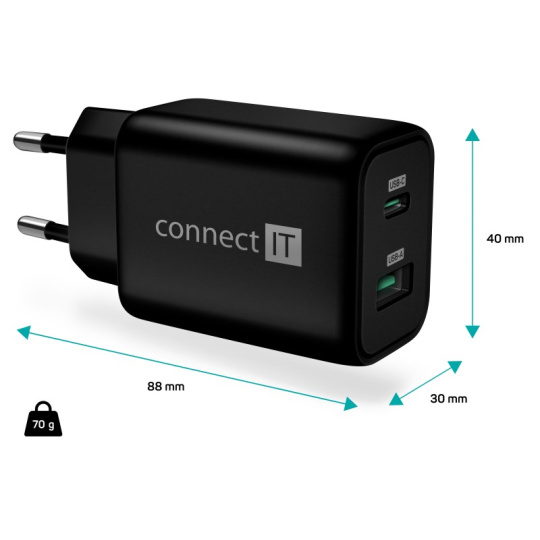 CONNECT IT Wanderer2 GaN nabíjecí adaptér 1×USB-C + 1xUSB-A, 33W PD, černá