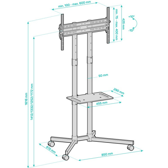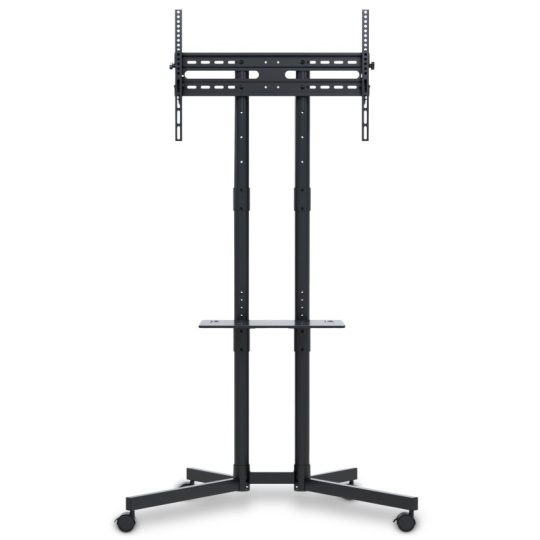 Velmi praktický pojízdný stojan je určen pro variabilní umístění TV kdekoliv v interiéru. Díky stojanu můžete přesouvat TV rychle a pohodlně kamkoliv podle potřeby. Navíc je vybaven praktickou poličkou na DVD, Set-top box atp. Robustní konstrukce z oceli unese spolehlivě až 40 kg obrazovku. Police má nosnost 10 kg. Stojan je kompatibilní s obrazovkami do úhlopříčky do 70" a pro nejvyšší možnou stabilitu je vybaven kolečky s brzdovou mechanikou proti nechtěnému pojezdu.
