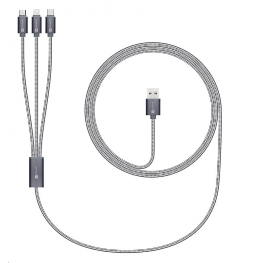 Univerzální nabíjecí kabel 3v1 na nabíjení zařízení s konektory Micro USB, Lightning a USB-C (Type C) umožňuje nabíjení až tří zařízení současně s podporou rychlého nabíjení pomocí max. proudového toku 2 A