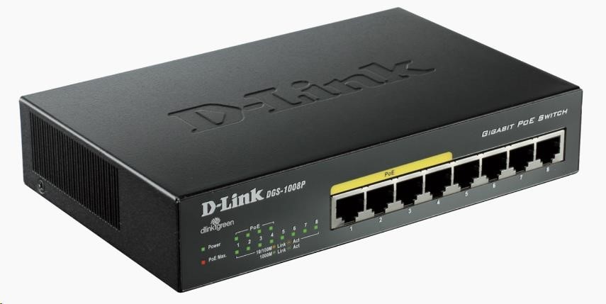 D-Link DGS-1008P 8-port Gigabit Desktop Switch, 4 porty jsou PoE+, PoE budget 68W