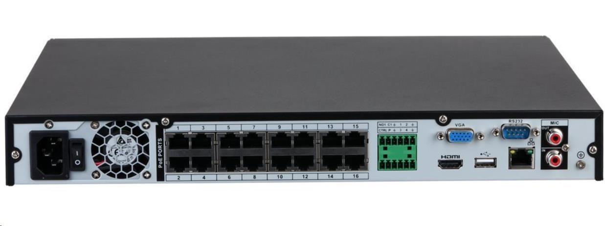 1× 10/100/1000 MbE RJ-45, 16× 10/100 Mbps RJ-45 PoE (IEEE 802.3 af/at), 1× audio vstup (RCA), 1× audio výstup (RCA), 4× alarm vstup, 2× alarm výstup, 2× USB 2.0, pozice pro 2× SATA HDD (max. 20 TB/disk), 1× HDMI, 1× VGA, 1× RS-232.