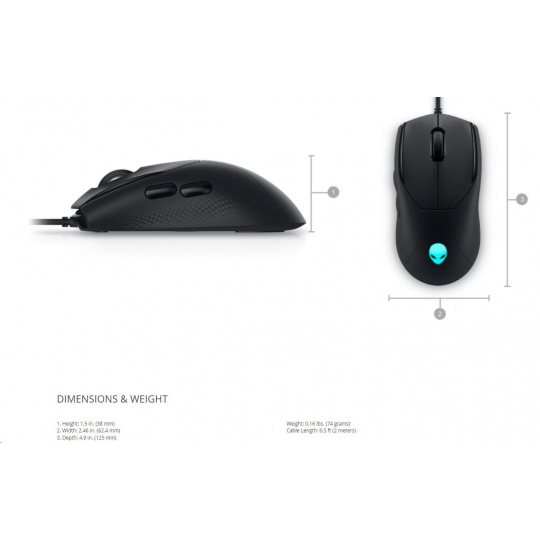 | Auto-calibration, 6 programmable buttons, 5 on-the-fly DPI settings, 16.8 million AlienFX lighting, 60 million clicks |