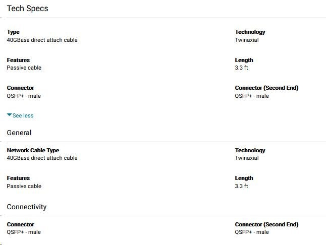 Owerview The Passive Direct attach copper cables provide highly reliable communication links with superior bit error rate (BER) performance. These copper cables are designed as a cost-effective and lower power alternative to optical cable assemblies for short length interconnects between active network equipment. Hot Pluggable QSFP+ - QSFP+ form factor Direct Attached Copper Cables Low power consumption and low crosstalk https://www.dell.com/en-us/work/shop/dell-networking-cable-qsfp-to-qsfp-40gbe-passive-copper-direct-attach-cable-1-meter-kit/apd/470-aavr/networking Type: 40GBase direct attach cable Technology: Twinaxial Features: Passive cable Length: 3.3 ft Connector: QSFP+ - male Connector (Second End): QSFP+ - male Compatibility This product is compatible with the following systems: Dell EMC Networking N2200-ON Dell EMC PowerSwitch Z9264F-ON Dell EMC PowerSwitch Z9332F-ON Dell EMC PowerSwitch Z9432F-ON Dell Networking N3132PX-ON Dell Networking S4112-ON Dell Networking S4128 Dell Networking S4148 Dell Networking S4148U Dell Networking S5212F-ON Dell Networking S5224F-ON OptiPlex GX260 MT PowerEdge C4140 PowerEdge C6420 PowerEdge FC640 PowerEdge M640 PowerEdge M640 VRTX PowerEdge R240 PowerEdge R340 PowerEdge R440 PowerEdge R540 PowerEdge R640 PowerEdge R6415 PowerEdge R740 PowerEdge R740XD PowerEdge R740xd2 PowerEdge R7415 PowerEdge R7425 PowerEdge R7515 PowerEdge R7525 PowerEdge R840 PowerEdge R940 PowerEdge R940xa PowerEdge T140 PowerEdge T340 PowerEdge T440 PowerEdge T640 PowerEdge XR2 PowerVault NX440.