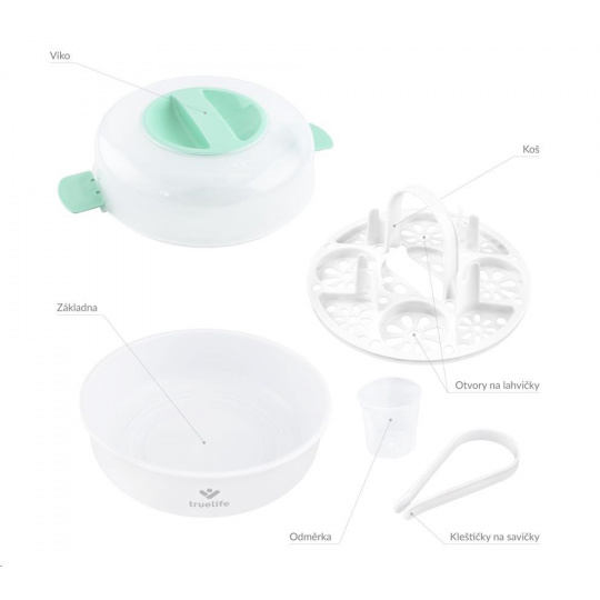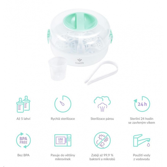 Ochrana imunitního systému vašeho dítěte pro vás nemusí znamenat neustálé vyvařování lahviček a dudlíků. Se sterilizátorem do mikrovlnné trouby TrueLife Invio MS5 sterilizujete dětské lahvičky, kousátka a další předměty během dvou minut. K tomu potřebujete jen obyčejnou vodu a mikrovlnou troubu. Sterilizátor využívá nemocniční metodu parní sterilizace, která je rychlá, účinná a bez chemických látek. Ničí tak 99,9 % bakterií a mikrobů, které se na dětských předmětech nacházejí, aniž by poškodil jejich povrch. Sterilizátor je navržen pro většinu mikrovlnných trub na trhu a zvládne většinu typů kojeneckých lahví. Pojme až 5 lahviček naráz a snadno se ovládá. Díky kompaktním rozměrům s ním můžete bez problému cestovat.