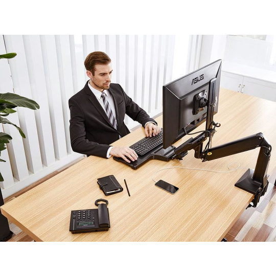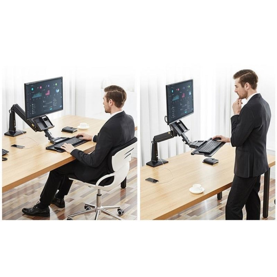 Držák monitoru a klávesnice NB NB35 Profesionální stolní držák na monitor 17-30" s poličkou na klávesnici 560x200mm, výškové polohování +/-480mm, naklápění +12°/-15°, otáčení +/-180°, pivot, možnost vysunutí a zaklopení police, přihrádka, 2x USB 3.0 porty, práce v sedě i vestoje, VESA 75x75 a 100x100, nosnost 9kg Univerzální stolní držák na monitor 17-30" a klávesnici pro ergonomické kanceláře, který Vám umožní kdykoliv změnit pozici pro práci jak vsedě tak i vestoje. Změna pozice je velmi snadná a rychlá, bez použití jakéhokoliv nářadí nebo složitého přenastavování - během okamžiku změníte výšku až o 480mm. Na držák je možné uchytit všechny typy monitorů s VESA standardem 75x75 nebo 100x100. Držák umožňuje snadné kompletní nastavení dle potřeby - otáčení do stran, výšková polohovatelnost, náklon obrazovky, posun a náklon police, vzdálenost od stolního uchycení, korekce roviny. Kvalitní duální úchyt pro zajištění na okraji stolu a perfektní fixaci. Profesionální kvalita, vynikající zpracování, krásný design a velmi snadné nastavení. Barevné provedení černé. Profesionální polohovatelný držák monitoru a klávesnice pro práci jak vsedě tak i vestoje NB NB35 Technické údaje: maximální zatížení 9kg minimální zatížení 2kg podporuje VESA standardy 75x75 a 100x100 možnost rozšíření VESA standardu na 200x100 nebo 200x200 ideální na monitory a televizory s úhlopříčkou 17-30" otáčení do stran +/- 180° náklon monitoru -12° / +15° funkce pivot - možnost polohy monitoru na šířku nebo na výšku maximální výška 950mm od stolové desky maximální délka od uchycení 1020mm celkové výškové nastavení +/- 480mm úprava výšky samotného monitoru na držáku 100mm police na klávesnici s rozměry 560x200mm možnost vysunutí police +/- 60mm, naklopení +/- 12°, možnost úplného zaklopení uchycení na okraj stolu, duální úchyt, na desky o síle 20-90mm 2x USB 3.0 port barevné provedení černé profesionální kvalita, snadná polohovatelnost záruka 3 roky Pracovní stanice - polohovatelný držák na monitor a klávesnici pro volbu, zda chcete pracovat vsedě nebo vestoje NB NB35Polohovatelný držák na monitor i klávesnici, výškové nastavení pro možnost práce vsedě nebo vestoje, snadné a rychlé polohování - Fiber Mounts NB35 Držák podporuje VESA standardy: VESA 75x75 VESA 100x100 Držák je vhodný pro uchycení všech typů monitorů a televizorů s úhlopříčkou 17-30", které podporují některý z výše uvedených VESA standardů a jejichž hmotnost je v rozmezí 2-9kg..