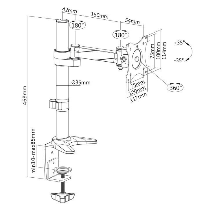 Držák monitoru na stůl Fiber Mounts M7C17 Stolní držák na monitor 13"-32", otočný +/- 180°, sklopný +/- 35°, výškové nastavení 100-380mm, funkce pivot +/- 360°, vzdálenost od nosníku 0-204mm, instalační materiál, 2 úchyty, VESA standard 75x75 a 100x100, nosnost 8kg Velmi pěkný, kvalitní a cenově dostupný stolní držák pro zavěšení všech typů a značek monitorů s úhlopříčkou 13" až 32". Plná nastavitelnost polohy obrazovky - otáčení do stran +/- 180°, naklápění +/- 35°, výšková regulace 100-380mm, funkce pivot = horizontální nebo vertikální otočení obrazovky +/- 360°, vzdálenost od stolního uchycení 0-204mm. Stolní držák podporuje VESA standardy 75x75 a 100x100, doporučené maximální zatížení je 8kg. Součástí balení je montážní materiál a 2 typy uchycení na stolové desky o síle 10-85mm - na krajní hranu stolu nebo skrz stolovou desku kdekoliv do prostoru. Držák je výborné kvality a pěkného designu. Záruka 5 let. Stolní držák monitoru do kanceláře nebo pracovny Fiber Mounts M7C17 Technické údaje: nosnost 8kg podpora VESA standardů 75x75 a 100x100 doporučujeme na monitory s úhlopříčkou 13" až 32" otáčení do stran +/-180° naklápění +/- 35° nastavitelná výška 100-380mm horizontální nebo vertikální otočení obrazovky = funkce pivot +/- 360° vzdálenost monitoru od nosníku 0-204mm 2 typy stolních úchytů (na okraj a do prostoru) na stolové desky o síle 10-85mm průměr nosníku 35mm, výška nosníku od stolové desky 400mm vynikající kvalita, profesionální zpracování snadné nastavení pozice obrazovky monitoru materiál hliník + ocel barva stříbrná + chrom záruka 5 let Kancelářský držák na monitor v profesionální kvalitě a krásném provedení Fiber Mounts M7C17 Ideální stolní držák do domácností, kanceláří, škol a podniků. Díky velmi pěknému designu, výborné kvalitě, snadné nastavitelnosti a dostupné ceně patří tento držák Fiber Mounts M7C17 mezi velmi oblíbené..