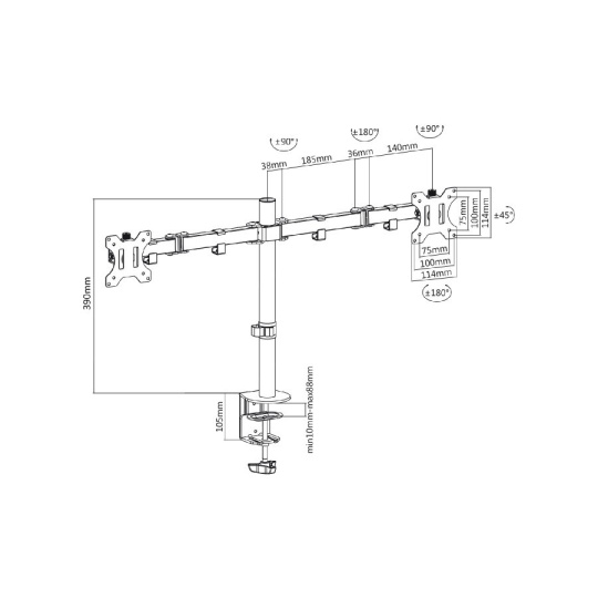 Držák na 2 monitory Fiber Mounts M8C84 Držák s uchycením na okraj stolu na 2 monitory 15-30", nastavení pozice monitorů, kvalitní konstrukce, VESA standardy 75x75 a 100x100, nosnost 16kg Držák pro zavěšení 2 monitorů a uchycení na okraj stolu. Snadná instalace a nastavení monitorů do požadovaných pozic. Držák podporuje VESA standardy 75x75 a 100x100 a zavěsit můžete monitory s celkovou hmotností až 16kg. Držák má kvalitní konstrukci, zavěšení monitorů je naprosto spolehlivé a bezpečné. Dodáváme včetně instalačního materiálu. Záruka 5 let. Stolní držák na 2 monitory Fiber Mounts M8C84 Technické údaje: nosnost 16kg (2 x 8kg) na monitory s úhlopříčkou 15-30" podpora VESA standardů 75x75 a 100x100 délka stolové tyče 390mm nastavitelná výška ramen otáčení do stran +/- 180° naklápění +/- 45° maximální délka ramen 397mm uchycení na okraj stolu, tloušťka stolové desky 10-88mm robustní kovová konstrukce snadná instalace, pevné a bezpečné zavěšení monitorů úchytky na kabeláž instalační materiál barevné provedení černé záruka 5 let Držák na 2 monitory s uchycením na stůl Fiber Mounts M8C84 Držák M8C84 podporuje VESA standardy: VESA 75x75 VESA 100x100 Držák je vhodný na monitory a displeje s úhlopříčkou 15-30", uchycení držáku je možné na stolové desky o síle 10-88mm. Maximální možné celkové zatížení je 16kg, 2 monitory po 8kg..