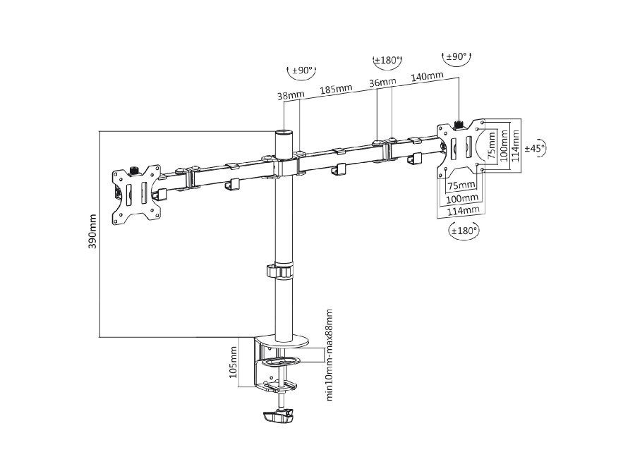Držák na 2 monitory Fiber Mounts M8C84 Držák s uchycením na okraj stolu na 2 monitory 15-30", nastavení pozice monitorů, kvalitní konstrukce, VESA standardy 75x75 a 100x100, nosnost 16kg Držák pro zavěšení 2 monitorů a uchycení na okraj stolu. Snadná instalace a nastavení monitorů do požadovaných pozic. Držák podporuje VESA standardy 75x75 a 100x100 a zavěsit můžete monitory s celkovou hmotností až 16kg. Držák má kvalitní konstrukci, zavěšení monitorů je naprosto spolehlivé a bezpečné. Dodáváme včetně instalačního materiálu. Záruka 5 let. Stolní držák na 2 monitory Fiber Mounts M8C84 Technické údaje: nosnost 16kg (2 x 8kg) na monitory s úhlopříčkou 15-30" podpora VESA standardů 75x75 a 100x100 délka stolové tyče 390mm nastavitelná výška ramen otáčení do stran +/- 180° naklápění +/- 45° maximální délka ramen 397mm uchycení na okraj stolu, tloušťka stolové desky 10-88mm robustní kovová konstrukce snadná instalace, pevné a bezpečné zavěšení monitorů úchytky na kabeláž instalační materiál barevné provedení černé záruka 5 let Držák na 2 monitory s uchycením na stůl Fiber Mounts M8C84 Držák M8C84 podporuje VESA standardy: VESA 75x75 VESA 100x100 Držák je vhodný na monitory a displeje s úhlopříčkou 15-30", uchycení držáku je možné na stolové desky o síle 10-88mm. Maximální možné celkové zatížení je 16kg, 2 monitory po 8kg..