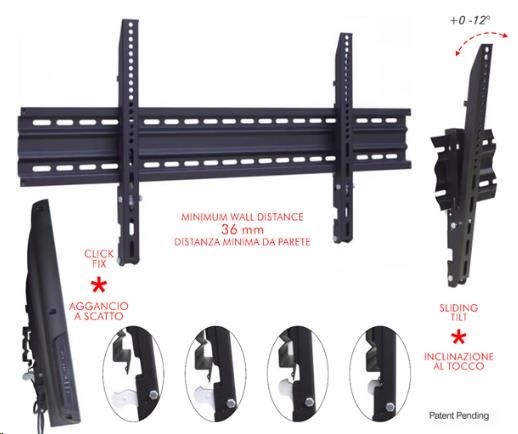 Technické údaje: nosnost 60kg na TV 37" - 65" vzdálenost od zdi pouhých 36mm náklon 0 / -12 st. VESA 100x100 - 800x400mm patentovaný systém náklonu a zajištění TV moderní design dodáván včetně materiálu na montáž odolná černá barva záruka 5 let.