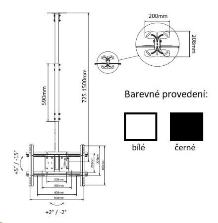 Technické údaje: maximální zatížení 68kg podpora VESA standardů 100x100 až 600x400 doporučená úhlopříčka obrazovky 32 až 60 palců nastavitelná délka 725-1500mm možnost náklonu obrazovky +5° až -15° dorovnání TV po montáži +/- 2° uchycení na strop nebo na stěnu - úchyt je možné přetočit o 90° otočný o +/- 30° vynikající kvalita moderní design barevné provedení černá záruka 5 let Držák podporuje VESA standardy: VESA 100x100 VESA 200x100 VESA 200x200 VESA 300x200 VESA 300x300 VESA 400x200 VESA 400x300 VESA 400x400 VESA 600x400.