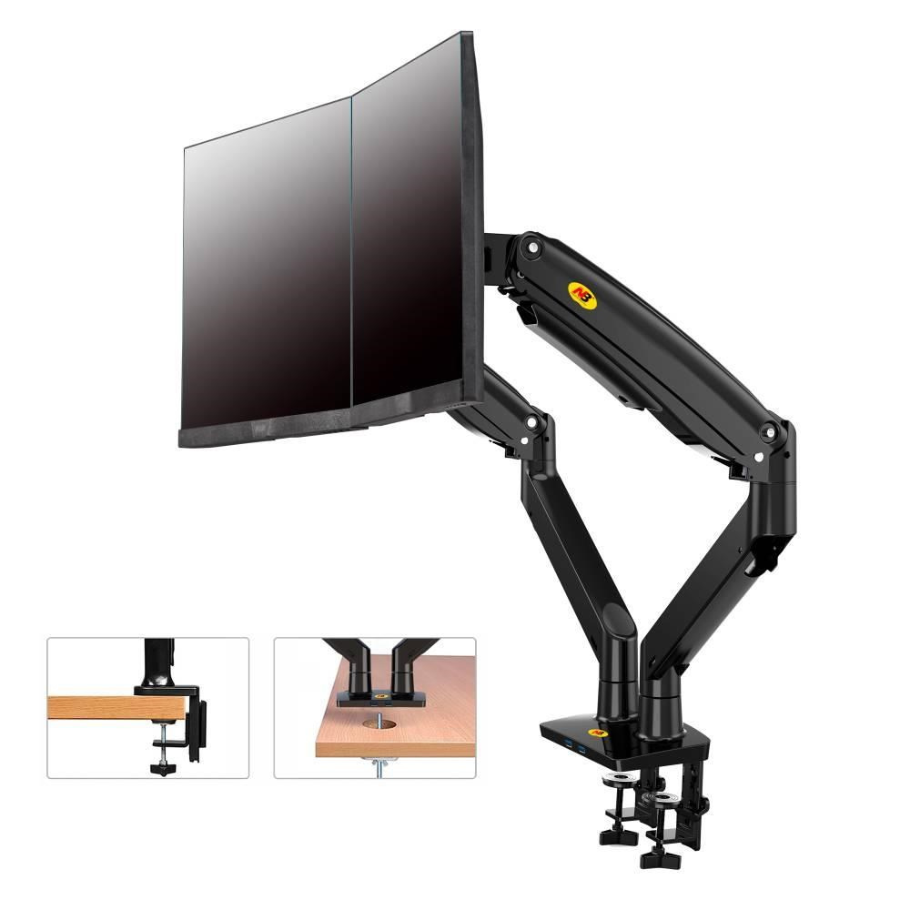 Dvojmonitorový stolní držák NB F195AB Profesionální stolní držák na 2 monitory 19-37", 3D nezávislé nastavení polohy, design, kvalita, ergonomie, VESA 75x75 a 100x100, nosnost 18kg Špičkový profesionální stolní držák pro zavěšení 2 monitorů a jejich nezávislé nastavení polohy: otáčení do stran, nastavení výšky, nastavení vzdálenosti od stolního úchytu, náklon, rotace obrazovky. korekce roviny. Hmotnost každého monitoru musí být v rozmezí 3-9kg. Balení obsahuje 2 typy úchytů na stolovou desku, instalační materiál a návod. Barevné provedení černé. Záruka 3 roky. Stolní držák na 2 monitory 19-37" do kanceláře nebo pracovny NB F195AB Technické údaje: celková nosnost 18kg hmotnost každého monitoru musí být v rozmezí 3 ÷ 9 kg podpora VESA standardu 75x75 a 100x100 v případě potřeby za příplatek možnost rozšíření VESA na 200x100 nebo 200x200 doporučená úhlopříčka monitorů 19" až 37" nezávislé nastavení výšky: min. 220mm, max. 565mm nezávislé otáčení monitoru do stran +/- 180° nezávislé naklonění monitoru +53° až -8° nezávislá rotace monitoru - otočení monitoru na šířku nebo na výšku, korekce roviny nezávislé nastavení vzdálenosti od stolního úchytu: 0mm až 700mm uchycení na stolové desky o průměru 10mm až 90mm balení obsahuje 2 typy úchytů na stolové desky (svěrák na okraj stolu + šroubovice do prostoru stolu) 2x USB port vynikající kvalita, krásný design snadné nastavení polohy monitorů spolehlivost, bezpečnost barevné provedení černé, stříbrné nebo bílé záruka 3 roky Polohovatelný stolní držák 2 monitorů do kanceláří a pracoven NB F195AB Dvojmonitorový stolní držák podporuje VESA standardy: VESA 75x75 VESA 100x100 za příplatek rozšíření na VESA 200x100 za příplatek rozšíření na VESA 200x200.