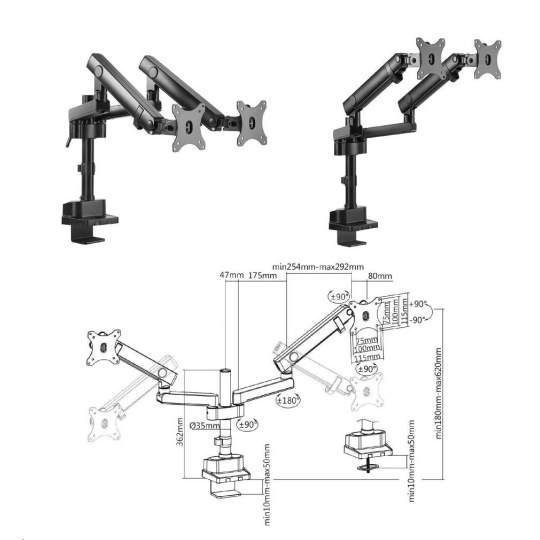 Profesionální stolní držák na 3 monitory Fiber Mounts M8C11 Plně nastavitelný kancelářský držák pro zavěšení tří monitorů 15-29", profesionální provedení, VESA 75x75 a 100x100, nosnost 21kg Profesionální systém pro uchycení a plnohodnotné polohování tří monitorů - otáčení do stran, náklon, délkové nastavení, rotace obrazovek. Držák podporuje VESA standardy 75x75 a 100x100. Maximální hmotnost monitoru 7kg (celková 21kg). Držák splní nároky každého uživatele. Profesionální stolní držák do kanceláře na 3 monitory Fiber Mounts M8C11 Technické údaje: celková nosnost 21kg (3 x 7kg) podpora VESA standardu 75x75 a 100x100 doporučená úhlopříčka monitorů 15" až 29" výškové polohování každého ramene 225mm až 575mm rotace obrazovek - možnost nezávislého otočení každého monitoru na šířku nebo na výšku nastavení vzdálenosti krajních monitorů možnost nastavení monitorů do příčky nebo do paraboly uchycení na stolové desky o průměru 10mm až 50mm stolový úchyt má integrované přípojky USB 3.0 systém vedení kabeláže materiál hliník a ocel barevné provedení černé záruka 5 let Stolní držák na 3 monitory Fiber Mounts M8C11 Držák na 3 monitory M8C11 podporuje VESA standardy: VESA 75x75 VESA 100x100 Profesionální držák na tři monitory s plnohodnotným polohováním. Držák je vhodný do kanceláří, pracoven, firem ale i domácnosti..