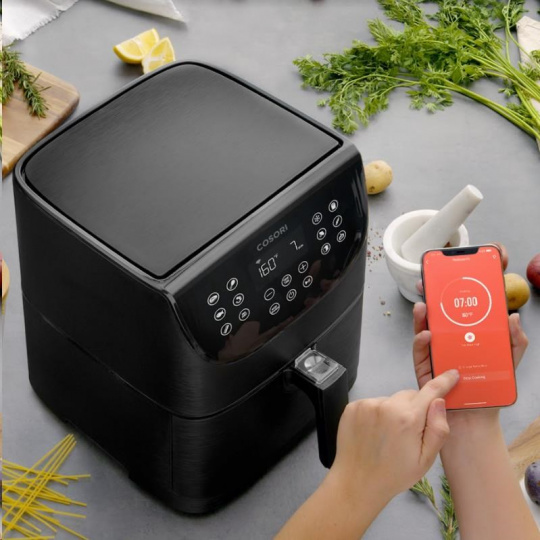 S horkovzdušnou fritézou COSORI CS158-AF PREMIUM SMART si můžete užít vaše oblíbená smažená jídla bez výčitek, protože na rozdíl od běžného smažení nebo fritování je v této horkovzdušné fritéze možné připravovat jídla za použití velice malého množství oleje nebo vůbec žádného. Kombinace cirkulujícího horkého vzduchu, dokonalé teploty vaření a chytrých programů zajistí, že hranolky budou vždy krásně křupavé a kuřecí stehna šťavnatá. Programy si rychle a pohodlně můžete nastavit také přes Smartphone nebo Amazon Alexa a Google Assistant. Až budete mít hotovo, čištění bude stejně snadné díky nepřilnavému koši, který lze mýt v myčce. Díky veliké nádobě s objemem 5,5l navíc dokážete rychle navařit i pro větší rodinu nebo skupinu hostů.