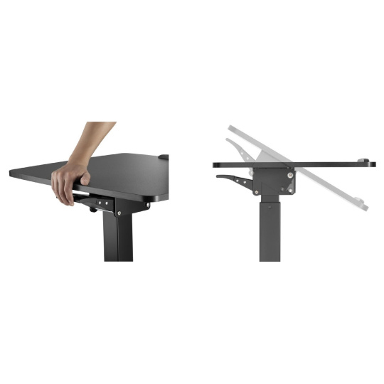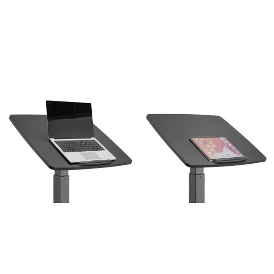 Stolek na notebook, laptop nebo projektor Fiber Mounts M8C92 Elektricky výškově nastavitelný stolek na notebook, laptop nebo projektor, náklopná pracovní deska 60*56cm se zarážkou, nosnost 8kg, pojezdová kolečka s brzdou Velmi kvalitní a zároveň i pěkný pracovní stolek na notebooky nebo laptopy s možností elektrického výškového polohování pro práci v sedě nebo i vestoje. Výškové nastavení 758mm až 1128mm, tichý a rychlý chod, ovládání nožní pákou. Stolek je možné použít i na projektory a dataprojektory. Možnost snadného přemístění díky pojezdovým kolečkům s aretací. Pracovní desku je možné manuálně naklápět z vodorovné polohy až o 30°, rozměr pracovní desky je 600*560mm. Kvalitní povrchová úprava v decentní černé barvě. Ideální stolek do kanceláří i domácností. Pracovní stolek do kanceláře nebo domácnosti, elektrické výškové polohování pro práci v sedě nebo vestoje, na notebooky, laptopy nebo projektory Fiber Mounts M8C92Pracovní stolek do domácnosti nebo kanceláře Fiber Mounts M8C92 Technické údaje: nosnost pracovní desky 8kg rozměrná pracovní deska 600x560mm elektrické nastavení výšky stolku 758-1128mm nožním pedálem tichý a rychlý chod možnost manuálního naklopení pracovní desky 0° až -30° vynikající pevná konstrukce kvalitní povrchová úprava v černém provedení design vhodný jak do kanceláří tak i domácností možnost práce na notebooku vsedě nebo vestoje pojezdová kolečka s aretací záruka 2 roky.