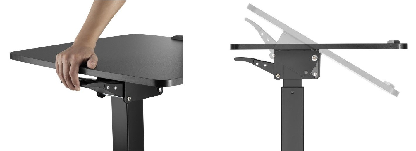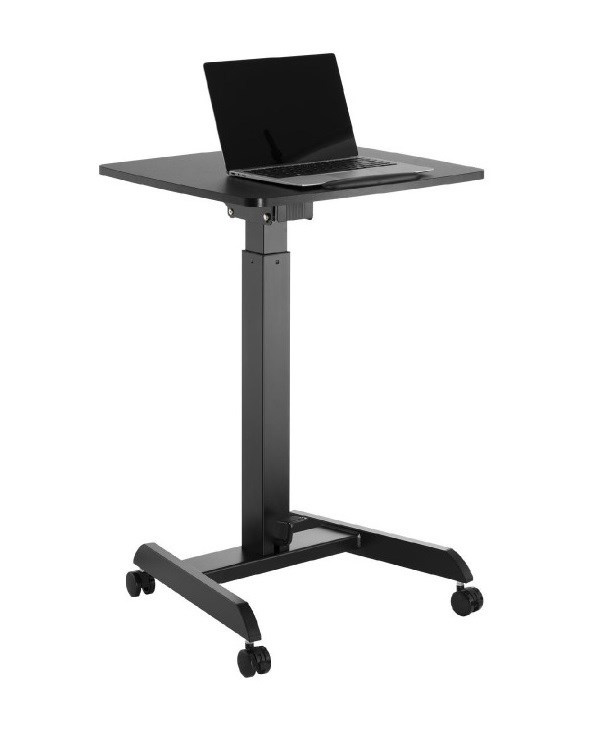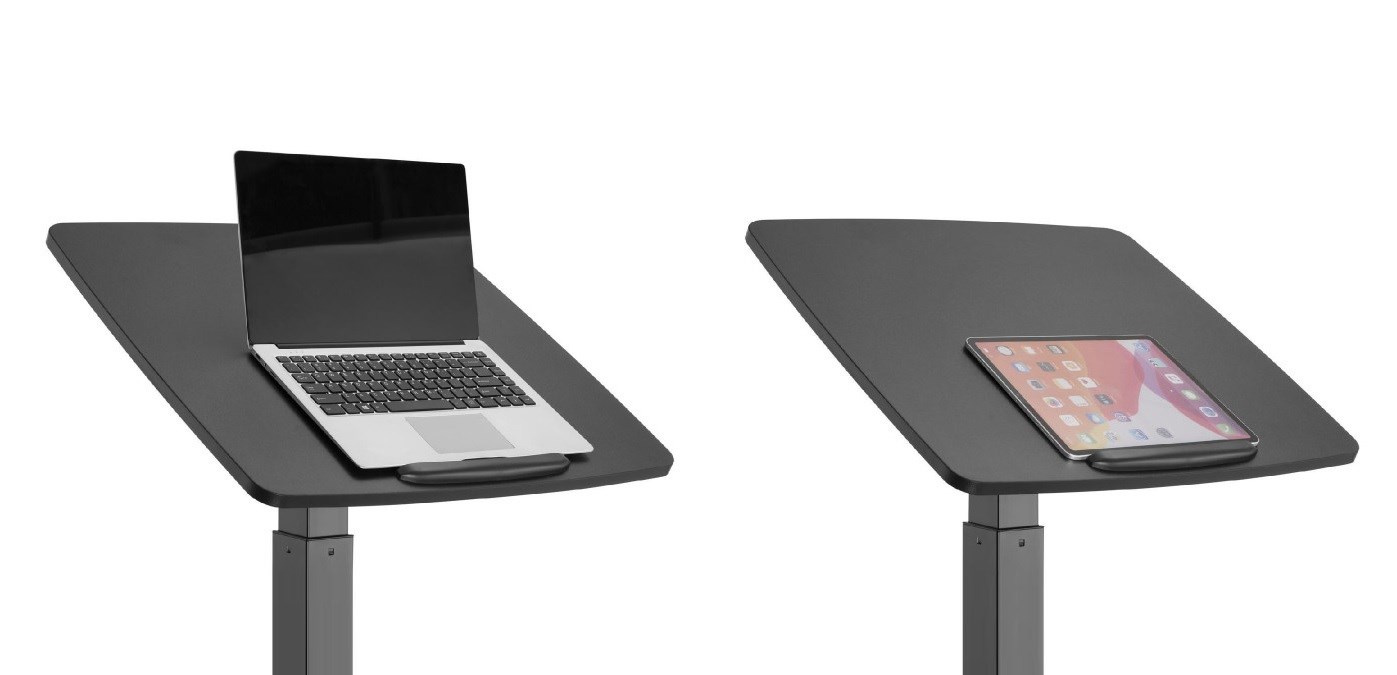 Stolek na notebook, laptop nebo projektor Fiber Mounts M8C92 Elektricky výškově nastavitelný stolek na notebook, laptop nebo projektor, náklopná pracovní deska 60*56cm se zarážkou, nosnost 8kg, pojezdová kolečka s brzdou Velmi kvalitní a zároveň i pěkný pracovní stolek na notebooky nebo laptopy s možností elektrického výškového polohování pro práci v sedě nebo i vestoje. Výškové nastavení 758mm až 1128mm, tichý a rychlý chod, ovládání nožní pákou. Stolek je možné použít i na projektory a dataprojektory. Možnost snadného přemístění díky pojezdovým kolečkům s aretací. Pracovní desku je možné manuálně naklápět z vodorovné polohy až o 30°, rozměr pracovní desky je 600*560mm. Kvalitní povrchová úprava v decentní černé barvě. Ideální stolek do kanceláří i domácností. Pracovní stolek do kanceláře nebo domácnosti, elektrické výškové polohování pro práci v sedě nebo vestoje, na notebooky, laptopy nebo projektory Fiber Mounts M8C92Pracovní stolek do domácnosti nebo kanceláře Fiber Mounts M8C92 Technické údaje: nosnost pracovní desky 8kg rozměrná pracovní deska 600x560mm elektrické nastavení výšky stolku 758-1128mm nožním pedálem tichý a rychlý chod možnost manuálního naklopení pracovní desky 0° až -30° vynikající pevná konstrukce kvalitní povrchová úprava v černém provedení design vhodný jak do kanceláří tak i domácností možnost práce na notebooku vsedě nebo vestoje pojezdová kolečka s aretací záruka 2 roky.
